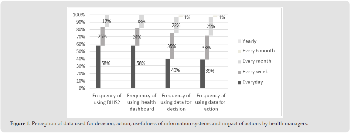 The respondents were asked whether the facility used data for decision-making. The majority (94%) strongly affirm data-driven decisions concerning immunization and maternal, neonatal, and adolescent health programs (Figure 1). The frequency of decisions made by managers was daily (40%) and weekly (35%) (Figure 2). Some decisions are also taken monthly (22%). During the COVID-19 pandemic, data was collected daily to get a real-time understanding of the situation. Decisions regarding COVID-19 vaccine requirements were crucial and had to be made daily. Among the significant dashboards, the most frequently used dashboard was COVID (58%), followed by Human Resource Management (13%), Reproductive health dashboard (11%), others (10%), and immunization, which was 9%. This answer could be biased as this question was administered during the COVID-19 pandemic, and the health managers were frequently asked to update information on the COVID-19 dashboard. Most health managers (96%) responded that the health management information system helps use the data for decisions (Figure 1). According to our survey, we inquired about the frequency of health managers utilizing District Health Information Software (DHIS-2). The responses indicated that the software is heavily used for analysis and decision-making. Specifically, 58% of respondents reported using the software daily, 25% reported using it every week, and 17% reported using it monthly (Figure 2).