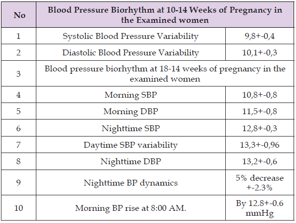A multivariate analysis of the anamnestic data identified the most significant risk factors for preeclampsia (Table 1). As can be seen from Table 1, the following preconditioning risk factors were identified based on the anamnesis: preeclampsia in a previous pregnancy (8.5%), preeclampsia in family history (6.1%), complications of a previous pregnancy (non-viable pregnancy, placental insufficiency, Fetal growth retardation syndrome, placental abruption) (12.2%), first birth before age 20 (13.4%), late birth after age 35 (4.9%), chronic arterial hypertension (7.3%), gestational diabetes (7.3%), thrombophilia (4.9%), metabolic syndrome (3.6%), kidney disease (8.5%), chronic endometritis (10.9%), other extragenital pathologies (6.1%), obesity (6.1%). Given that chronic uteroplacental ischemia is the leading concept in the development of preeclampsia, and blood flow in the uterine arteries is an indirect marker, we conducted a Doppler assessment of the pulsatility index (PI) in these vessels in high-risk pregnant women. At 10–14 weeks of pregnancy, PI ≥95th percentile was observed in 17 women (20.7%): 5 with late preeclampsia and 12 with early preeclampsia. At 18–24 weeks of pregnancy, the same figure was observed in 18 women (21.9%): 7 with late preeclampsia and 11 with early preeclampsia. Disturbances in the circadian blood pressure biorhythm in pregnant women with preeclampsia, in particular the development of a nocturnal circadian rhythm (non-dipper type), are of scientific and practical interest. Research in recent decades has convincingly demonstrated the prognostic significance of insufficient nocturnal blood pressure reduction (Table 2).