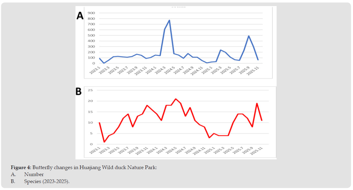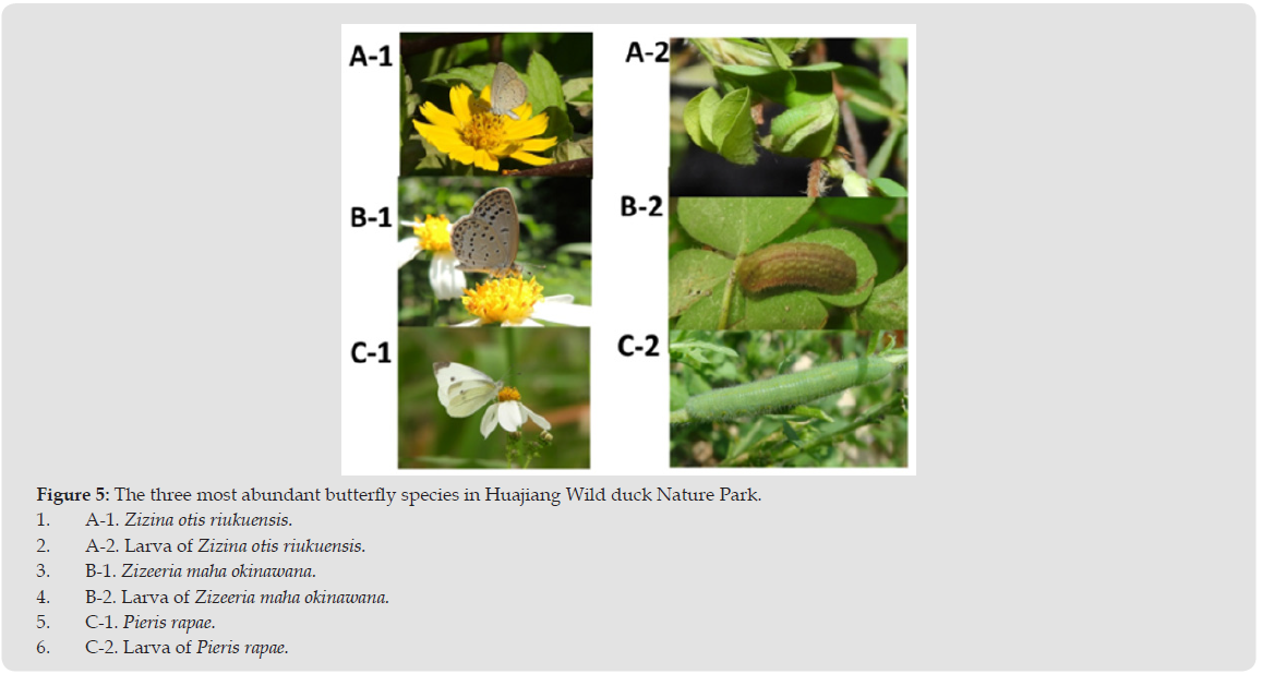 Butterfly survey was conducted monthly from 2023 to 25th between Huajiang Bridge and Zhongxing Bridge, using a cross-line survey method. A total of 1537 butterfly individuals from 44 species across 5 families were recorded. The Nymphalidae family had the most species (19), followed by the Skimmer family (7). The most numerous species were Zizeeria maha okinawana and Zizina otis riukuensis (552 individuals combined), followed by Pieris canidia and Pieris rapae (524 individuals combined) (Figure 4). The nectar sources for butterflies included 20 species from 11 families, with the Asteraceae family having the most (7 species). All other families had only a single species. The most frequently visited flower species were Bidens pilosa var. radiata (21 species from 5 families), followed by Sphagneticola trilobata (9 species from 4 families). Weeding should be avoided during its flowering season. Butterflies primarily feed on low-growing herbaceous plants, typically less than 20cm tall. However, weeding below 10cm in height can endanger the survival of butterfly larvae on these plants. Skipper larvae feed on grasses considered weeds, such as Miscanthus floridulus and Pennisetum purpureum, specifically the tender tips of these leaves. During their breeding season, weeding should be avoided. Weeding is also unnecessary during April, when butterfly populations are highest, and May, when the most diverse species appear (Figure 5).