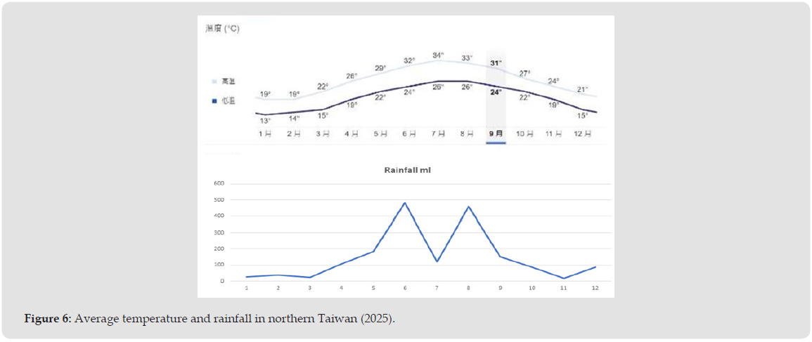 According to data from the Central Weather Administration, weather analysis in northern Taiwan shows that the average annual temperature exceeds 30 degrees Celsius from June to September, with July recording the highest at 34 ̊C, followed by August at 33 ̊C. The average annual rainfall exceeds 400 mm in June and August, with June recording the highest rainfall, followed by August. It is best to avoid weeding during the months with the highest average temperatures and rainfall, as ground cover plants can protect the ground and soil from erosion and damage caused by heavy rain and high temperature (Figure 6).