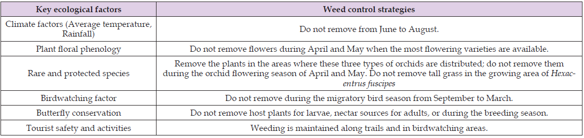 Based on the results of the various monitoring studies above, a comprehensive weed control management strategy is proposed, as shown in the Table 1. Although this article uses Taipei’s Huajiang Wild duck Natural Park as an example, it aims to serve as a starting point, providing a basis for weed control in all parks, green spaces, national parks, school lawns, botanical gardens, forest recreation areas, and other similar venues, ensuring that weed control is ecological, cost-effective, and environmentally sustainable. The model presented in this article can provide a theoretical foundation for habitat management and serve as a reference for monitoring climate change, ecological conservation, and environmental education [1-5].