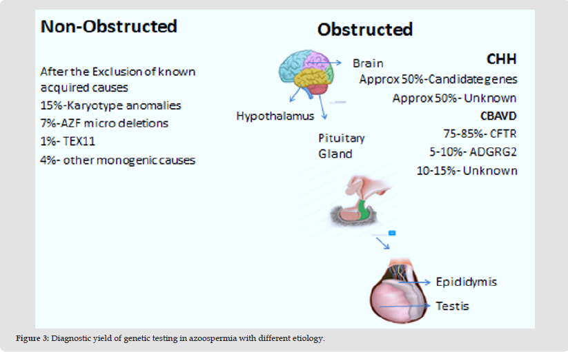 The male infertility can be exclusively diagnosed by semen analysis where three important parameters are observed; sperm concentration, motility and appearance. As per WHO 2010 male infertility can be classified based on seminogram under following categories: Azoospermia - Absence of sperm in the ejaculate. It can be classified as obstructive azoospermia [OA] where absence of sperm in the ejaculate is detected as a result of problems in sperm delivery or non-obstructive azoospermia [NOA] where there is absence of sperm in the semen due to abnormal sperm production. NOA constitutes 60% of all cases of azoospermia.