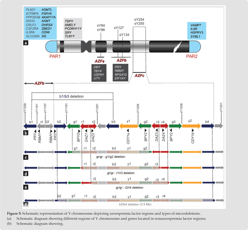 Microdeletions on the long arm of the Y chromosome (Yq) represent a significant pathogenic factor linked to male infertility. Tiepolo and Zuffardi showed a connection between deletions of the Y chromosome and male infertility in 1976 [82]. These Yq microdeletions are observed in approximately 13% of azoospermic men and in 1% to 7% of men with severe oligozoospermia, defined as having a sperm count of less than 0.5 million/mL. The deletions are primarily concentrated in intervals 5 and 6 of the Y chromosome and are classified under the Azoospermia Factor (AZF), as the most severe phenotype associated with these deletions is azoospermia. The AZF region is further divided into three distinct, non-overlapping areas known as AZFa, AZFb, and AZFc. Six genes located within the AZF regions are exclusively expressed in the testes and are referred to as “AZF candidate genes.” The AZFa region includes about 400–600 kb of DNA. It is located in the proximal section of deletion interval 5. It contains two protein-coding genes, USP9Y and DBY (recently renamed DDX3Y). Deletions in the AZFa loci are associated with Sertoli-cell-only syndrome, type I. The AZFb region spans about 1–3 Mb of DNA and is located from the distal part of deletion interval 5 to the proximal end of deletion interval 6 (subintervals 5O–6B). The protein-coding genes within the AZFb region include EIF1AY, RPS4Y2, and SMCY, which are found in X-degenerate euchromatin, as well as HSFY, XKRY, PRY, and RBMY, located in the ampliconic region.