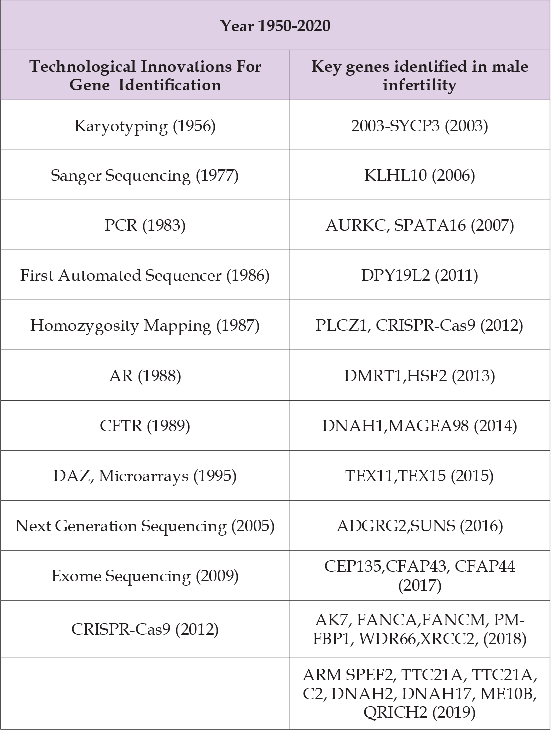 Table 2: Timeline of the discovery of key genes involved in male infertility identified using technological innovations.