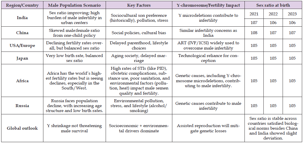 In western countries like Europe, USA, and Japan, similar infertility issues exist, but advanced reproductive technologies (IVF, ICSI, sperm banking) mitigate long-term impacts. Fertility decline is mostly sociological (delayed marriage, lower birth rates), not genetic. Like India similar situation exists in China, historically skewed sex ratios due to sociocultural preferences have created demographic imbalances (more men than women). Globally, male population reduction due to Y chromosome gene loss is unexpected. What’s more realistic is that fertility rates will decline due to lifestyle, environment, and socioeconomics rather than chromosome shrinkage. Birth data is usually reported as total live births per year and often broken down by sex ratio at birth (SRB), i.e., number of male births per 100 female births. Global biological norm is approximately 105 male births per 100 female births. Sex ratio at birth is around 1.05. Some countries deviate from this biological norm due to cultural, medical, or demographic factors [125].