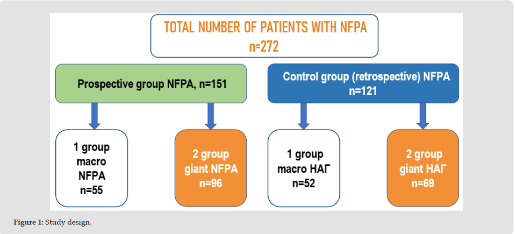 According to the size of the pituitary adenoma, prospective patients (151 patients) were divided into 2 groups: Group 1 - patients with macro- NFPA - 55 people, Group 2 - patients with giant NFPA - 96 people.