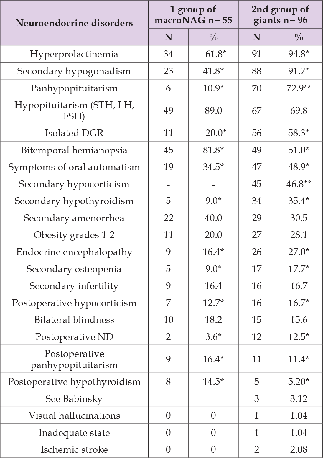 2. Panhypopituitarism (10%/73%), secondary amenorrhea (40%/30.5%), isolated growth hormone deficiency (20%/58%), endocrine encephalopathy (16%/27%) and obesity (20%/28%) were observed with different frequencies in the first and second groups. Less common, but still present, were postoperative panhypopituitarism (12%/17%), secondary osteopenia (9%/17%), and Babinski’s sign (0%/3%). Thus, the clinical picture of the disease was characterized by pronounced polymorphism.