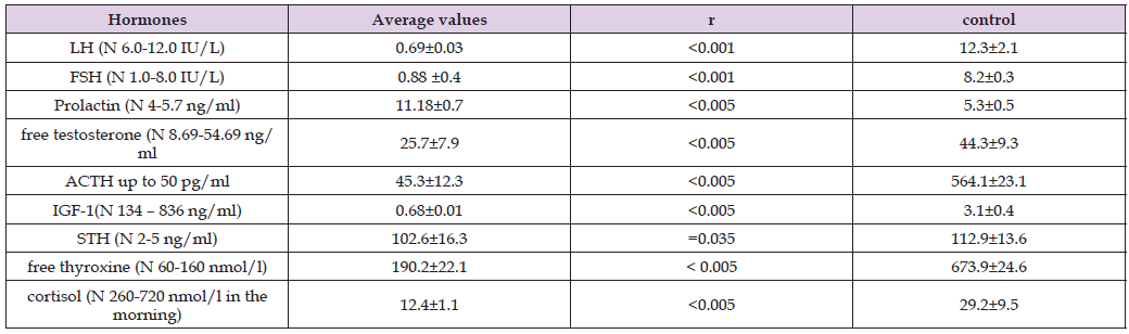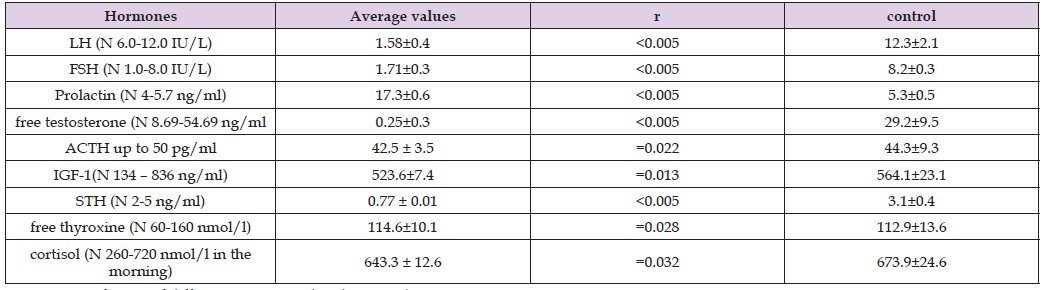 Thus, there was a polymorphism of symptoms. Furthermore, the most pronounced neurological impairments were manifested by symptoms such as oral automatism (43.7%), endocrine encephalopathy (21.2%), ischemic stroke (1.3%), hallucinations (0.6%), inappropriate state (0.6%), Babinski’s sign (1.9%), and decreased muscle tone (2.6%), respectively. Moreover, neurological symptoms such as Babinski’s sign and decreased muscle tone were characteristic of tumor growth into the brain, and these symptoms predominated in patients with giant NFPA s. Disorders such as secondary osteopenia and endocrine encephalopathy were detected only in patients in Group 2. Thus, the most severe neuroendocrine and ophthalmological diseases were observed in patients in Group 2. Tables 4 & 5 show the mean basal plasma hormone levels by group. As can be seen from the data in Table 4, the levels of tropic hormones (LH, FSH, STH) in Group 1 were significantly reduced (p < 0.005) compared to the control group against the background of significantly increased PRL and low free testosterone (p < 0.005). The levels of free thyroxine and ACTH were within normal limits. The clinical picture of hypogonadotropic hypogonadism was characteristic of patients in Group 1. Table 5 shows the average value of plasma hormones in patients of group 2 is given.