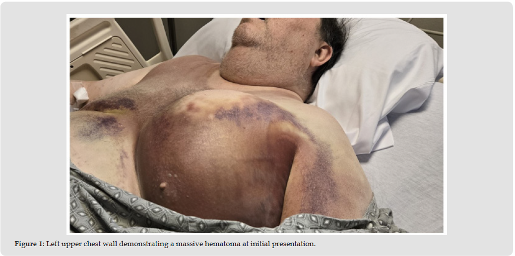 The patient is a 67-year-old male with a significant medical history including antiphospholipid antibody syndrome (on chronic warfarin for prior DVT/PE), CHF, paroxysmal atrial fibrillation, type 2 diabetes, Parkinson’s disease, and morbid obesity. He presented to the Emergency Department with worsening left chest wall swelling, associated pain, and ecchymosis. The patient was recently hospitalized for severe sepsis secondary to Streptococcus bacteremia, likely originating from a left lower extremity ulcer. Following discharge to subacute rehab, he developed acute pain, swelling, and bruising of the left chest wall. Subsequent CT imaging revealed active extravasation, along with bilateral pulmonary infiltrates concerning for pneumonia. General Surgery evaluated the patient and recommended no acute surgical intervention. To address his anemia, he was transfused 4 units of packed RBCs. Although Gastroenterology was consulted, they deferred endoscopic evaluation. An IVC filter was successfully placed by Interventional Radiology. During his course, he developed C. difficile colitis and was started on oral vancomycin. The initial working diagnosis was a hematoma, possibly related to a ruptured vessel or a possible coagulopathy. The patient’s laboratory workup revealed a WBC of 4.5, hemoglobin of 7.1, and platelets of 105. Renal function showed a mildly elevated BUN (29) and creatinine (1.42). Glucose was elevated at 171.