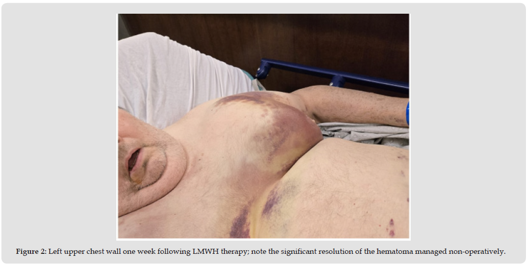 Coagulation studies were within normal limits (PT 12.2, INR 1.0, aPTT 34.7). His D Dimer was high at 2645. Further testing for the presence of a lupus anticoagulant, anti-cardiolipin antibodies, and anti- beta-2 glycoprotein I antibodies, were not done as the patient had a confirmed diagnosis of APS. Imaging studies, including a chest X-ray and CT scan, confirmed the presence of a large hematoma on the left chest wall (Figure 1), with no evidence of significant underlying vascular injury. Given the patient’s presentation with a massive hematoma in the absence of trauma and the confirmed diagnosis of antiphospholipid antibodies, APS was diagnosed as the underlying etiology. The patient was treated with anticoagulation therapy low-molecular- weight heparin (LMWH)), and the hematoma was monitored with serial imaging. There was no recurrence of bleeding, and the patient’s hematoma and symptoms gradually improved (Figure 2). Further workup revealed no other thrombotic events, and the patient was managed on long-term oral anticoagulation with warfarin.