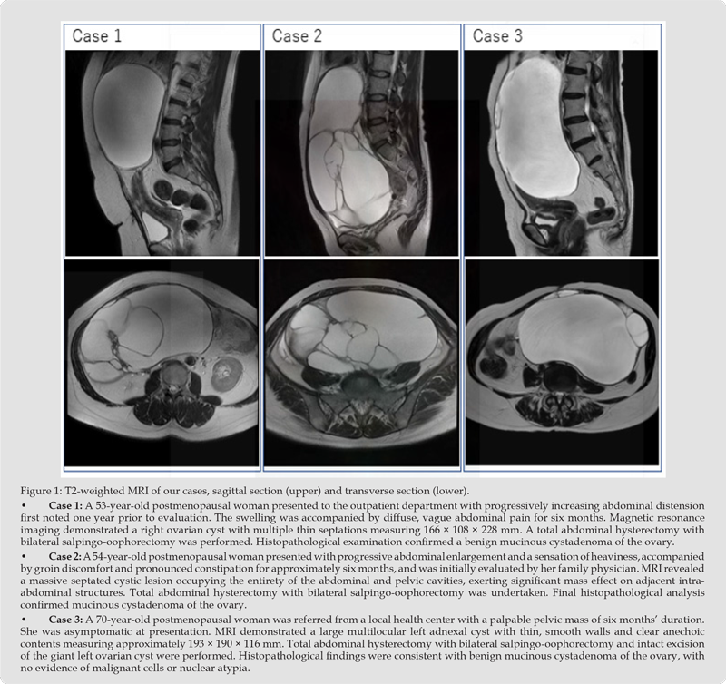In postmenopausal women or when malignancy is suspected, total hysterectomy with bilateral salpingo-oophorectomy is generally advocated. Although laparoscopy represents a first-line approach for many adnexal cysts, its applicability in the management of giant cysts remains limited. Technical constraints, particularly restricted operative space, render laparoscopic excision of extremely large ovarian cysts feasible only in highly selected cases and in the hands of experienced surgeons. Although cystadenomas are benign epithelial neoplasms, rare cases of coexistence with anaplastic carcinoma or malignant ovarian Brenner tumors have been reported [10]. According to available literature, mucinous tumors are typically unilateral, as observed in our cases (Figure 1), and are classified as benign (75%), borderline (15%), or malignant (10%). If untreated, these neoplasms may progress to invasive mucinous carcinoma [3-5,11]. Benign ovarian mucinous cystadenomas constitute the majority of mucinous tumors [3-5,11]. They are capable of attaining extraordinary dimensions and rank among the largest tumors recorded in the human body, as exemplified by our patients. In postmenopausal women, the incidence of borderline ovarian tumors declines significantly and is therefore relatively uncommon. Mucinous tumors most frequently arise during the fifth and sixth decades of life; however, their true incidence in postmenopausal women may be underestimated due to earlier detection. Our patients were 53, 54, and 70 years of age and postmenopausal at the time of diagnosis.