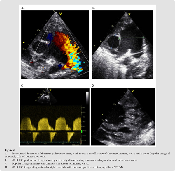 In patients 2 and 4, all pathological findings in the mentioned segments of the right heart are described, and on this basis the correct prenatal diagnosis was made with the name APVS (Absent pulmonary valve syndrome). In both cases, a pathological arterial duct is suspected, which was also shown by the postnatal diagnosis, and in both cases, right ventricular cardiomyopathy is also suspected, with the fact that in patient 4, who has an isolated form of APVS, the entity form of cardiomyopathy is referred to as non-compaction right ventricular cardiomyopathy (NC-RVCM), and in patient 2, it is only described right ventricular hypertrophy. It is extremely important to note that the patient with the so-called tetralogy type had a small, stenotic, atypical duct through which only the left branch of the hypoplastic pulmonary artery was supplied.