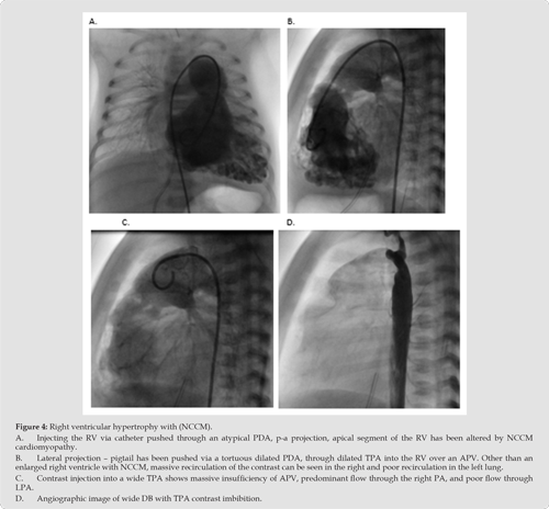 The patient received an early Contegra conduit, the VSD was closed, the LPA was connected to the TPA, and a stent was implanted in the LPA with ligation of the atypical, stenotic duct through which the LPA was supplied. In addition to this description, we find other similar descriptions [9,24]. The most recent report on the importance of the pathological form of the Botallo’s duct for the development of right-sided lesions described within the concept of APVS was given by Gewillig in 2017 on the example of 27 fetuses diagnosed with a dysfunctional Botallo’s duct [8]. He believes that various anomalies of the duct may be the reason for changes in the right heart, primarily in the pulmonary valve, and then in the pulmonary blood vessels. He mentions ductus obstruction, transient constriction, kinking (kneelike fold) and aneurysm, i.e. tortuous and wide ductus of Botallo [25]. He also mentions the right ventricle as a potential site of suffering, including the development of non-compaction cardiomyopathy. Our paper describes in detail an isolated form of APVS (patient 4) who had a wide, tortuous (siphonic) ductus (early ligation), and in addition to other described anomalies, had severe non-compact cardiomyopathy of the right ventricle (see Figures 2 & 4).