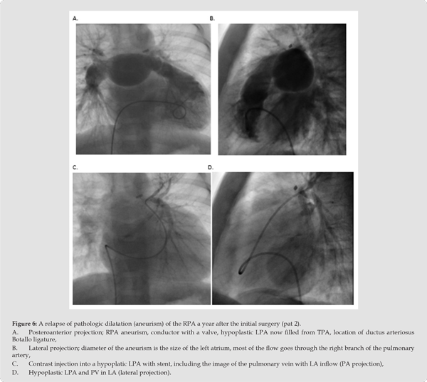 One DA was aneurismatic dilated (Pat. 3), and one was atypically tortuous and wide (Figure 4, Pat. 4)). A ductal anomaly should also be suspected in the first patient (Pat. 1) who was born as a premature child, but it was not diagnostically verified in the period until it theoretically could have closed delayed (3 months after delivery), but a complete absence of the ductus is also possible because it is the socalled TF type of APVS. In addition to the aneurysmal expansion of the TPA, all patients also had marked dilatation of the RPA, and only one had extremely wide both branches of the pulmonary artery (patient 3). We note that as many as three patients had hypoplasia of the left branch of the pulmonary artery (patients 1, 2, 4) (Figures 3 & 4), and patient 2 had extreme hypoplasia of the LPA, which filled through the restrictive DB, and was initially completely separated from the RPA. In patient 3, in whom VSD was mentioned prenatally, we did not find it postnatally, and two patients (pat. 1,2) had right-sided anomalies with subaortic VSD. We did not use the term TF anywhere with certainty because we believe that the basic characteristic of TF is a significantly smaller pulmonary artery than the aorta, while our patients with VSD (pat. 1 and 2) had a significantly wider PA than the aorta. The mean pulmonary artery pressure (mPA) in one patient (pat. 1) was 31 mmHg (measured at the age of 11 months), and the other patients had mPA below 25 mmHg. (pat. 2,3,4).
