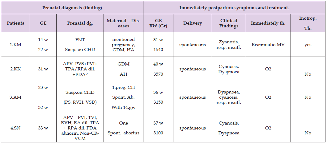 All four deliveries were spontaneous (vaginal), one child was born prematurely at 31 weeks of gestation and with a birth weight of 1540 g, and the others were born at 36-40 weeks, with a normal birth weight. Three children had postnatal cyanosis with dyspnoea and were treated with oxygen, and one patient was resuscitated and immediately placed on mechanical ventilation with inotropic support (patient 1). (Table 1). He remained on mechanical ventilation practically until the end of his life at the age of 2 years. Based on the data in Table 2 (Table 2), a large difference is observed between the prenatal and postnatal diagnosis in two patients (1 and 3). Although both were examined (according to the available data prenatally on two occasions), only a generalized diagnosis of possible CHD was made in them, mainly due to suspicion of ventricular septal defect (VSD) and pulmonary stenosis (PS). In both cases, it is evident that the prenatal diagnosis did not pay attention to the circumstance of possible pathological DA, dilatation or hypertrophy of the right ventricle and atrium or tricuspid insufficiency (TI). Patient 1 had the so-called tetralogy type and probably did not have DA, and patient 3 had an isolated type with severe PS and wide pulmonary blood vessels.