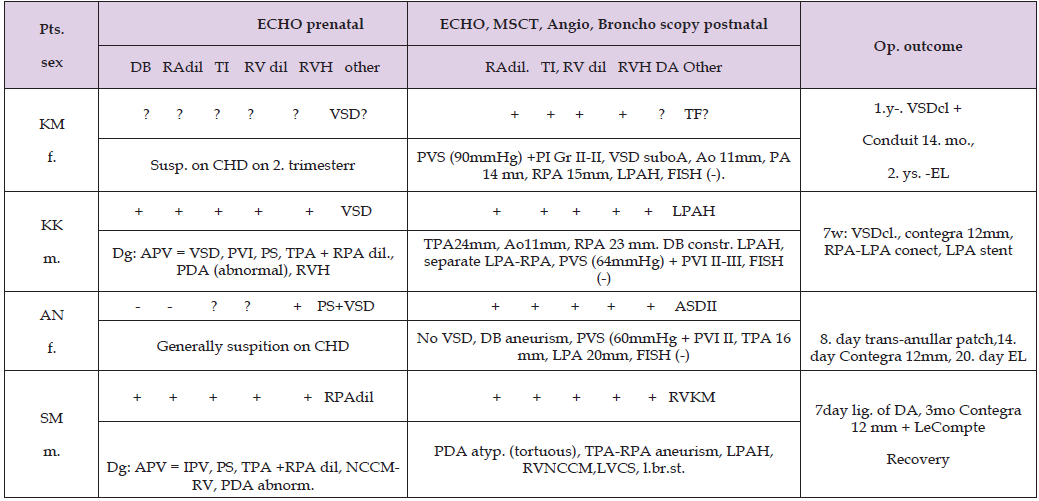 Note: Legend: RA: Right Atrium; RV: Right Ventricle; RVH: Right Ventricular Hypertrophy; CHD: Congenital Heart Disease; APV: Absent Pulmonary Valve; RPA: Rihgt Pulmonary Artery; RVH: Right Ventricular Hypertrophy; PVI: Pulmonary Valvular Insufficiency; PVS: Pumonary Valvular Stenosis; NCCMRV: Non Compaction Cardiomyopathy Of Right Ventrilce; LPAH: Left Pulmonary Artery Hypoplasia; PVI: Pulmonary Valve Insufficiency; PDA: Persitent Ductus Arteriosus; EL: Exitus Letalis; VSD cl.: Closure Of Vsd; DA lig.: Ligaturo Od Ductus Arteriosus; m: Male, f: Female.
