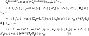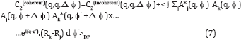 Now in integrating over ϕ neither q nor q’ ever become zero unless one considers q=0 or q'=0, which only exist under the beam stop, and are therefore not measured. Thus in practice the 2nd and 3rd terms on the RHS are negligible since they are associated with random phases. On the other hand, the 4th term has an argument of the exponential that can become zero even on the resolution ring, and therefore does not need to be small at the points where the argument becomes zero. Here C2(incoherent) contains only contributions from the first incoherent summations in (3) and (4) in addition to the newer coherent terms. The 4th term contains double sums in (3) and (4). In the end only the 1st and 4th terms survive, and one may write, to a good approximation