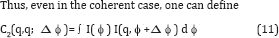 Where C2(incoherent) contains only contribution from the first (incoherent) summations in (3) and (4) and the remaining term contains the specifically interparticle interference effects that arise from the coherence of the XFEL. Here Δϕ represents the vector in the direction of increasingΔϕ. For most values of Δϕ, the randomness of Rj-Rk makes the phases associated with the exponential random and thus the difference between the coherent and incoherent expressions become negligible. An exception occurs when Δϕ approaches zero. Then despite the randomness of Rj- Rk the phases of the exponential terms tend towards zero, which is clearly not random. It will also be noted that at this point Aj(q, ϕ + Δϕ) ® Aj(q, ϕ) and Ak(q, ϕ+Δϕ) ® Ak(q, ϕ), and so the integrand of (7) ® Ij(q, ϕ) I_k(q, ϕ) which is always positive.
