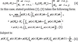 Where L1(Hi,Hj) and L2Hi,Hj) are the losses of incorrectly accepted and incorrectly rejected hypotheses. It is clear that the " 0-l" loss function is a private case of the step-wise loss (1). For loss functions (1), one of possible statement of CBM takes the form [3-5].
