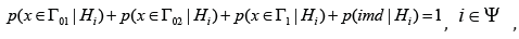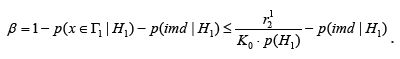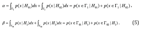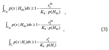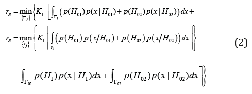Here p(Hi), p( x| Hi ), i∈Ψ , Ψ ≡ {01,02,1} are a priory probability and the marginal density of x given Hi, Γi is hypothesis Hi acceptance region, ri2 are the restriction levels, K0 and K1 are the losses for incorrectly rejection and incorrectly accepting of hypotheses, respectively.